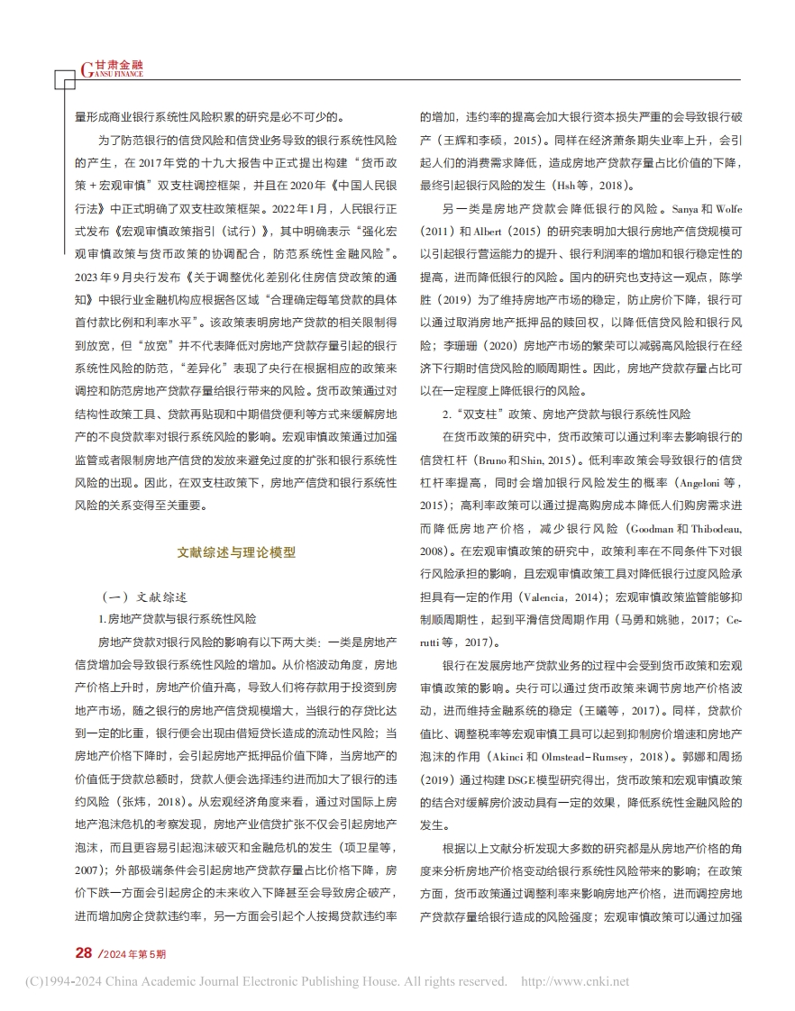 EMPIRICAL ANALYSIS实证分析【基金项目】国家社科基金项目“西部民族地区普惠金融影响经济高质量发展的空间效应研究”(21$Y045);新疆社会科学基金项目“新疆绿色技术创新的金融支持体系研究”(21BY062);新疆财经大学研究生科研创新项目“金融集聚、人力资本与绿色全要素生产率”(XJUFE2023K015);新疆自然科学基金项目“数字金融服务新疆实体企业‘脱虚向实'的路径与对策研究”(2022D01A39)。房地产信贷存量是否会引起商业银行系统性风险积累?基于“双支柱”政策调控的视角⊙张喜玲左璐【内容简介】文章选取2011一2022年我国16家上市银行的微观面板数据,分析房地产货款存量对银行系统性风险的影响以及“双支柱”政策对两者之间的调节作用。研究结采发现:(1)房地产货款存量对银行系统性风险的影响呈现正U型趋势;(2)“双支柱”政策在房地产贷款存量与银行系统性风险的关系中具有正向的调节作用;(3)房地产信货存量对银行系统性风险的影响在银行性质、行业规模以及经济周期方面存在异质性,相较于非国有银行和规模较小银行,房地产贷款存量对国有大行和规模较大股份制银行的系统性风险的影响更为有效。同样,经济衰退期相较于经济扩张期,房地产贷款存量对银行系统性风险的影响更为显著。根据结论提出完善细化政策框架、坚持“疏堵结合”的方法以及加大防范风险的“堤坝”等政策建议。【关键词】银行系皖性风险;房地产信贷存量;“双支柱”政策在内的重点邻域风险防范与化解仍是2024年的重点工作。因引言此,研究房地产贷款存量对银行系统性风险的积累具有重要的现实意义。2023年9月末我国间接融资占社会融资总规模的70.78%',现今全球经济的不稳定性,存量房的积累、房贷存量的积商业银行扮演着至关重要的角色,而银行贷款总额中与房地产相聚以及房贷的不良贷款率不断的增加,导致了房地产贷款存量关的贷款约占22.67%。房地产经济的发展可以带动社会经济的占比成为系统性金融风险的诱因之一;2020年8月,房企融资发展,如果房地产贷款存量一旦出现大范围不良将会导致银行业“三道红线”新规发布,中国恒大三线全踩,遭遇融资受限风险。的账面资金流动性不足,同时也会导致银行资产端短缺从而导致2021年9月31日恒大宣布“破产”,引起相关金融行业对债务风银行发生系统性风险。2021年12月中央经济工作会议以及党的险关注。恒大房地产“暴雷事件”、2022年碧桂园“保交楼”、房二十大报告中均强调“防范化解重大风险”“守住不发生系统性地产存量房的积聚以及房贷利率政策调整,导致房地产贷款存量风险的底线”;2023年12月8日中央政治局会议强调包括房地产占比对银行业风险受到行业内的广泛关注。所以对房地产信贷存作者简介:张喜玲,经济学博士,新疆财经大学金融学院副教授:左璐,新疆财经大学金融学院硕士研究生。Gansu Finance/甘肃金融/27(C)1994-2024 China Academic Journal Electronic Publishing House.All rights reserved.http://www.cnki.net