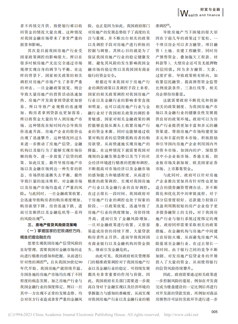财富生活>>Fortune Life房地产信贷风险产生的原因、危害及可行性建议■文/许丽香摘要:近年来,随着我国国民经济的持续快速发展、住房改革的持续变化与城市化进程的加快,我国房地产业呈现出喷式发展的局面,并逐渐成为国民经济的新增长点与理财热点,房地产信贷在这样的大环境背景下也取得了飞速的发展和进步,我国商业银行信贷其较高的安全性与稳定性成为我国房地产行业重要推动力量,并建立了深度的绑定与协作,随着我国房地产行业规模的迅速增长,其风险也在不断增加,我国金融行业与其的合作也在逐渐加深,近2年地产行业可谓风云变幻,大型房企屡屡暴雷,这种情况在间接上也将房地产行业当中的风险之间蔓延至我国的金融行业当中,我国对房产信贷风险控制相较于发达国家的处理手段仍然存在一定的差距,导致了房地产信贷风险没有得到良好的控制。房地产行业以及金融行业对于我国的经济发展以及社会稳定都具有非常重要的价值和意义,这种风险逐渐受到了社会各界的普遍关注与重视,国家随即出台各项政策对各地房地产行业进行了调控,希望对房地产信贷风险进行良好的控制,从而保护我国商业银行以及降低我国金融风险,本文首先对我国房地产信贷风险进行简要阐述,其次对其产生的原因以及危害做出进一步的分析,最后根据目前我国房地产信贷风险提出相应的防范策略,希望能够帮助我国快速降低房地产信贷风险,保证我国房地产行业以及金融行业的稳定、可持续发展。关键词:房地产信贷;风险产生原因;危害分析;可行性建议一、房地产信贷风险概述规贷款的还款周期,面对个人的住带来了诸多不可控因素,同时也带(一)房地产信贷的定义房贷款,还款周期往往能够达到来了诸多难于预见的金融风险,商根据目前我国房地产信贷相关二十年左右,对于开发商的贷款,业银行与房地产市场相互叠加的风工作开展情况上来看,房地产信贷也会比常规的贷款期限更长。险更是难以预见和控制。这些情况广义上主要是指银行或金融机构以二、房地产信贷风险产生的原因都在一定程度上导致了房地产的信房地产为服务对象,围绕着房地产及危害贷风险。再生产各个环节发放贷款的借贷活(一)房地产信贷风险产生的(二)房地产信贷风险产生的动。在这个过程当中,金融机构会原因危害将社会闲置资金的支配权输送到房根据当下我国房地产信贷的主房地产信贷风险对我国房地产地产行业当中,用于房地产的开发要模式上来看,我国商业银行的信行业以及金融行业的稳定均造成了建设以及购房者的资金需要。从狭贷虽然具有可靠性高、风险较小等严重的危害和影响。首先是对我国义上来说,指的是房产或地产的开特点,但是由于其自身的诸多特质,商业银行的资金风险带来了非常严发、经营、消费活动有关的信贷活仍然导致其具有诸多风险因素。首重的危害,我国房地产行业从20世动,即房地产贷款。先,房地产信贷相较于其他的金融纪90年代开始快速升温,一直持续(二)房地产信贷的特点贷款具有更长的周期性,长达十年到现在,国家对房地产行业也持续房地产信贷具有诸多有区别于到三十年,这种长周期的性质本身给予了高度的关注与重视,政府以常规金融活动的特质,首先,其具就增加了诸多的风险因素,长时间及有关部门也在基于当地社会经济有更高的专用性,也就是说房地产的还款周期给信贷环节增加了诸多的发展状况以及房地产行业非正常信贷专门用于房地产行业,仅限于不确定性因素,这种因素对于信贷发展进行了及时的调控与改革,很房地产的开发、经营以及消费服务,风险都造成了进一步地加深。其次多政府通过收紧政策,诚少购房者通常情况下,相关金融机构对其有是房地产信贷所涉及的金额较大,的购买欲望实现了对“购房热”的专项的资金使用管理。其次,房地加之房地产市场的波动,非常容易有效降温,但是这样的做法也非常产信贷具有较长的周期性,相较于造成后期商业银行的金融风险。最容易导致金融市场受到波及和影响,常规金融信贷活动,地产信贷的周后,金融政策的实时调整以及我国很多地区在政策持续收紧的情况下,期较长,还款的时间要远远高于常市场经济的飞速变化给房地产信贷房价持续下跌,从而导致贷款购房(C13 China Academic Joural Electronie Publishing House.All rights reserved.http://www.enki.net
