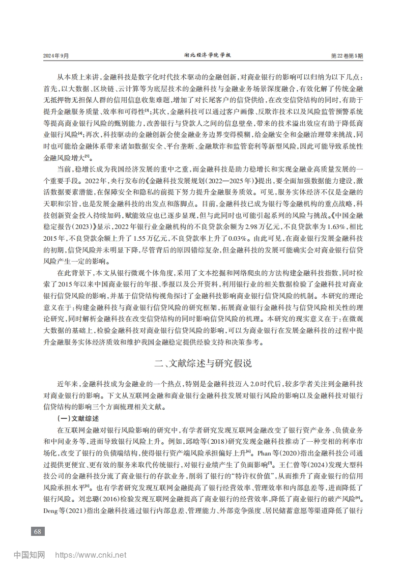 D金融探索与买践装期游北经济学院学级Journal of Hubei University of Economiesdoi:10.3969/1 i.issn.1672-626x.2024.05.006金融科技对商业银行信贷风险的影响效应基于信贷结构视角何云12,赵珺一2,范伟3(1.数字金融创新湖北省重点实验室(湖北经济学院),武汉430205;2.湖北经济学院金融学院,武汉430205:3.郑州大学商学院,郑州450001)摘要:金融科技在推动商业银行经营多元化和创造利润增长,点等方而发挥了较大作用,但新型的经营业态也可能对商业银行的信货风险防范带来新的挑战。本文收集了201S一2021年的625家商业银行数据,检验了金融科技对商业银行信货风险的影响,并基于信货结构视角探讨了金融科技影响商业银行信货风险的机制。研究发现,金融科技降低了商业银行信贤风险,同时也增加了商业银行信货风险防范的信心,但金融科技对不同类型商业银行信货风险的影响具有异质性,更有助于降低地方性商业银行的信货风险:金融科技在小微信货领城的风险防范效果最明显,其次是在雾售信货领城,在企业信货领城的风险防范效果最差。政策建议是:商业银行应积极融入金融科技发展的浪潮:推广金融科技在不同信货领城的应用:不同类型的商业银行应结合自身特点提高金融科技的研发力度:监管层应同步提高监管水平,大力发展监管科技,防范金融科技可能引发的系统性金融风险。关键词:金融科技;商业银行:信货风险:信货结构中图分类号:F832文献标志码:A文章编号:1672-626X(2024)05-0067-15一、引言经过近几年的快速发展,金融科技已渗透支付清算、融资模式和风险管理等多个金融领域。从推进金融业变革的技术角度来看,金融科技的发展经历了三个阶段:第一阶段为金融科技1.0阶段(2011一2013年),即金融T阶段,以传统的T软硬件在金融业的应用为特征,实现了办公业务的电子化和自动化,提高了业务效率:第二阶段为金融科技2.0阶段(2013一2016年),即互联网金融阶段,互联网金融科技平台实现了快速发展,但同时对传统金融业产生了巨大的冲击:第三阶段为金融科技3.0阶段(2016年至今),金融科技平台带来的压力迫使商业银行顺应时代发展趋势,不断加大金融科技研发的资金投入,由此改变了传统商业银行的信息采集、风险定价以及投资决策的方式,推动了传统商业银行向数字化、智能化和网络化方向转型-。收稿日期:2024-03-28基金项目:湖北省教育厅科学研究计划指导性项目“金融科技对商业银行信货风险的影响效应研究”(B2022141)作者简介:何云(1991一),女,河南信阳人,数字金融创新湖北省重点实验室(湖北经济学院)研究员,湖北经济学院金融学院讲师,经济学博士,研究方向为金融业开放与金融风险管理;通说作者赵琚一(1999一),女,安微阜阳人湖北经济学院金融学院硕士研究生,研究方向为跨境资本流动与金融风险防范:范伟(1987一),男,河南南阳人,郑州大学商学院讲师,经济学博士,研究方向为宏观金融与宏观经济。67中国知网htps:/www.cnki.net
