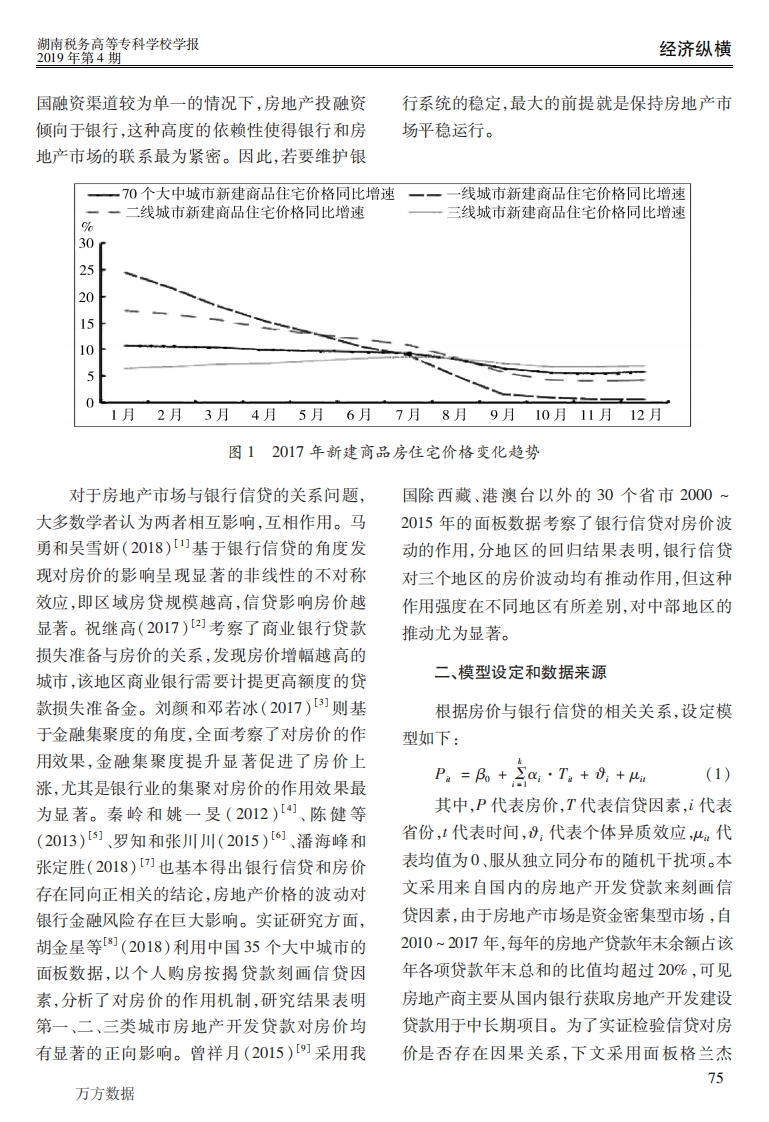 2019年8月第4期湖南税务高等专科学校学报Vol.32 No.4第32卷(总第168期)Journal of Hunan Taxation CollegeAug.2019商业银行房地产信贷风险管理研究马喜立12(1.华夏银行,北京100005;2.清华大学,北京100084)摘要:采用2010~2017年30个省份的面板数据,基于面板格兰杰因果检验分析信贷对房地产市场波动的影响,进而分析对商业银行资产风险的影响及相应采取的应对措施。通过对房地产市场的反思,从信贷的雏度来分析对房地产市场波动的影响,进而分析对银行系统乃至整个金融体系稳定性的影响,并从多个方面提出有针对性的建议,以期为我国房地产市场平稳运行提供有益启示。关键词:信贷;房价波动;商业银行资产风险管理中图分类号:F830.572文献标识码:A文章编号:1008-4614(2019)04-0074-05一直保持在五分之一以上,若把房地产相关产一、我国房地产行业现状与银行信贷关系业计算在内,则占比近四分之一。我国房价经历了近二十年的快速增长,房随着资本市场的繁荣发展,绝大多数金融地产行业逐渐成为国民经济的支柱产业,对国危机都或多或少与房地产市场有着密切关系。内投资的推动和GDP的提升起到重要的促进资产价格的波动影响着信贷市场的稳定,并催作用。近二十年来,不同城市房地产市场逐渐生了危机的形成。在我国,银行作为整个金融产生分化,以房价指数为衡量标准,截止到体系的主体,银行对风险的把控是影响金融体2017年年底,(如图1)70个大中城市整体上呈系稳定的最重要因素。与此同时,伴随着房地现上涨趋势,其中北上广深4个一线城市房价产市场过热,银行作为直接的金融中介,在房有所回落,31个二线城市和35个三线城市房地产市场中的业务量不断加大,房地产贷款占价上涨幅度高于一线城市。一方面,房地产是银行贷款比重稳步上升,由于住房作为抵押一切生产部门的物质空间基础,尤其是在城市物,房价波动将波及到银行系统,并影响到整现代化进程的背景之下;另一方面,房地产上个金融体系的稳定。相对于多数发达国家而下游产业链长,对多个相关产业有着举足轻重言,我国金融体系仍十分脆弱,金融市场不够的影响。据测算,从2007年至2017年这十年健全。自1998年住房货币化改革以来,房地产间,房地产投资占全社会固定资产投资的比重市场的非理性繁荣催生了泡沫的产生。在我*收稿日期:2019-06-12基金项目:国家自然科学基金资助项目(71603051)“中国房地产市场分化的成因及其与地方政府举债行为的联动效应研究”。作者简介:马喜立(1983一),男,河北沧州人,经济学博士,华夏银行博士后科研工作站、清华大学博士后科研流动站联合在站博士后,研究方向为资产管理和金融风险。74万方数据